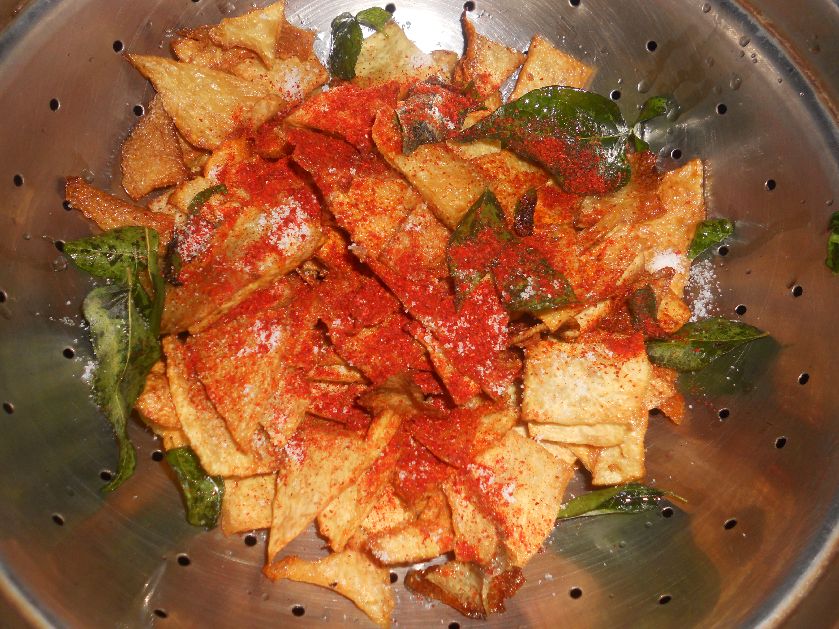 5. put the chips in a bowl and add roasted curry leaves, red chilli powder & salt. mix thoroughly.