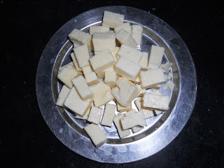 8. in the meantime, slice the fresh paneer into small pieces.