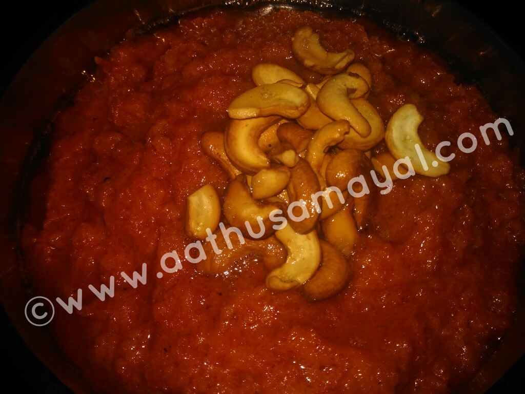 5. Heat ghee in a spoon, fry cashew and add to halwa. Add cardamom powder to it and mix well.